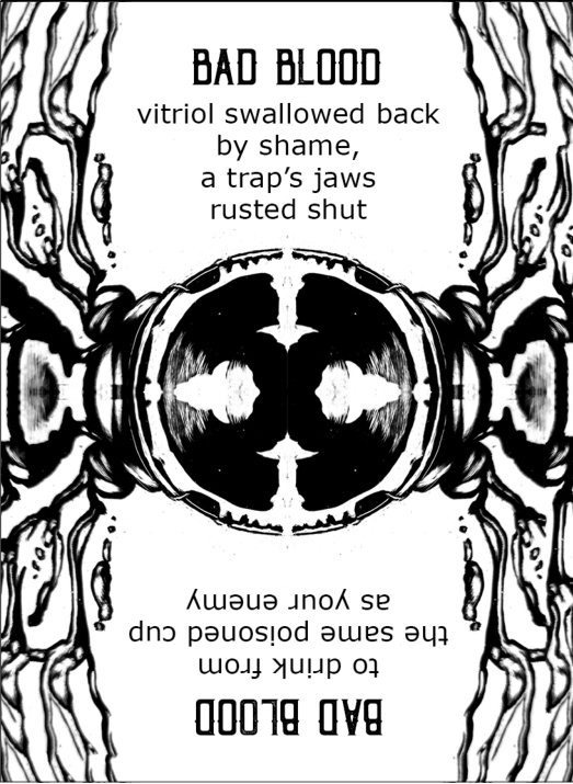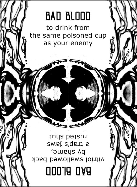 Bad Blood. Vitriol swallowed back by shame, a trap’s jaws rusted shut. Take just a second, don’t let me hand you the answer. Study the art on the card, latch onto any words that seem interesting. What feeling does it elicit?